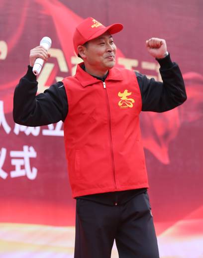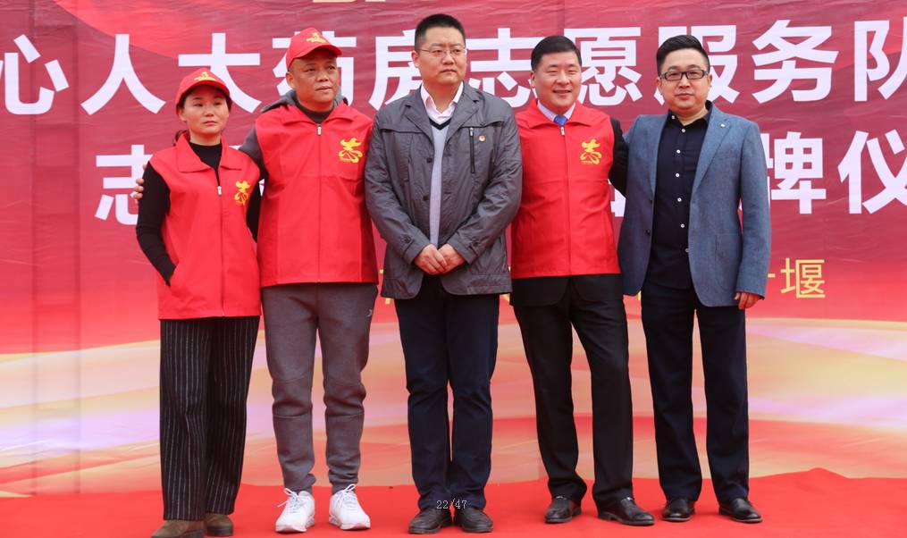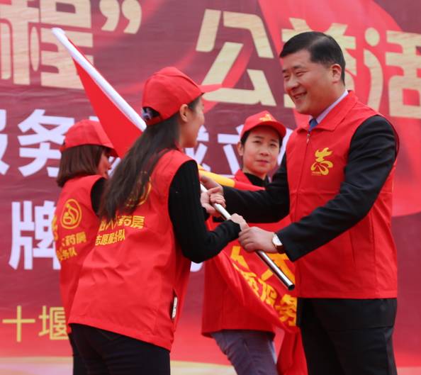 用心人大藥房連鎖有限公司董事長吳軍軍為志愿服務(wù)隊(duì)授旗。
