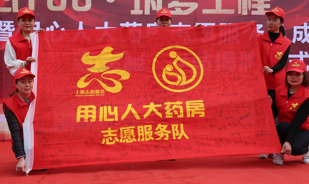 志愿者服務(wù)隊(duì)隊(duì)長陳建立發(fā)言并代表宣誓。他說:志愿服務(wù)能夠幫助到更多需要幫助的人,我們?cè)敢庾鳛閻坌牡氖拐?,給大家?guī)砀嗟臏嘏蛶椭?,同樣我們也收獲到更多的快樂。愿我們攜起手來,高擎“用心人大藥房志愿服務(wù)隊(duì)”的鮮紅旗幟,秉承志愿精神,用責(zé)任和擔(dān)當(dāng)為“用心人大藥房”品牌形象奏響一曲青春之歌,共同為十堰市文明創(chuàng)建添磚加瓦。